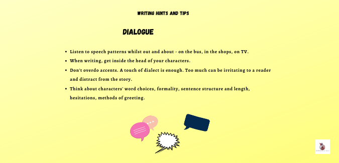 - Don’t overdo accents. A touch of dialect is enough. Too much can be irritating to a reader and distract from the story.